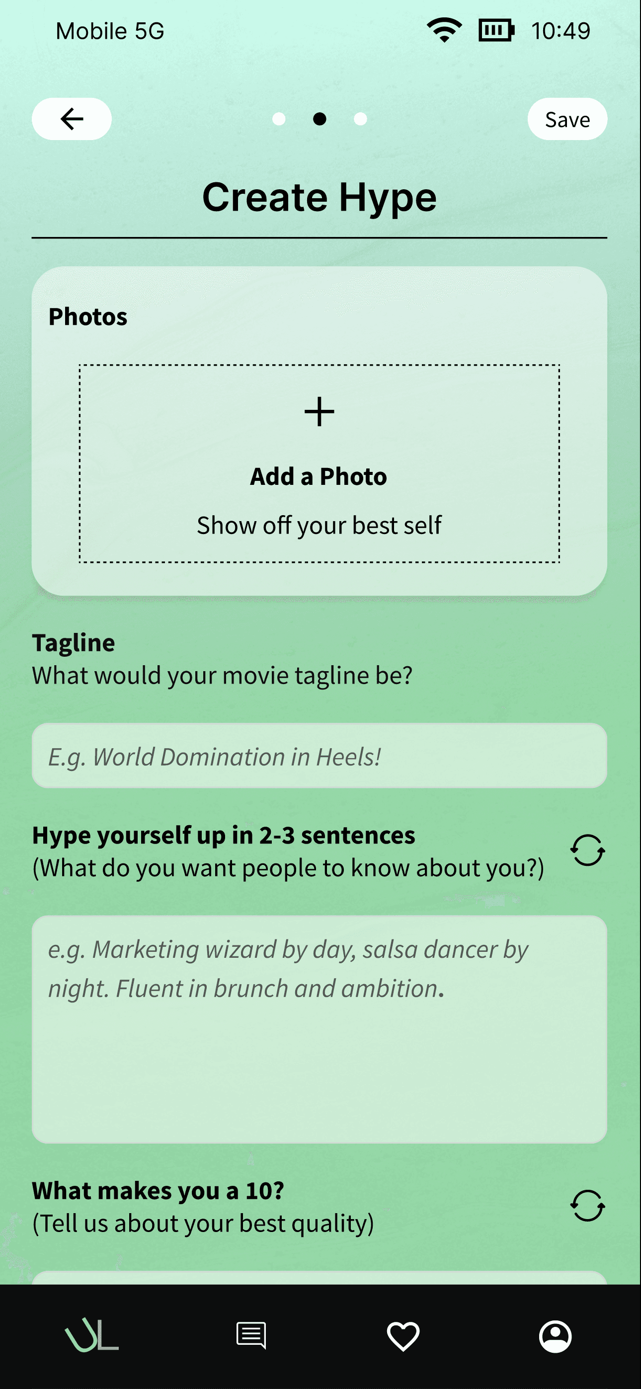 Created two distinct profile types (Hype and Unhinged) with step-by-step prompts and creative features like audio uploads, memes, and "Overshare" questions to help users express both polished and authentic sides without feeling exposed or uncertain.